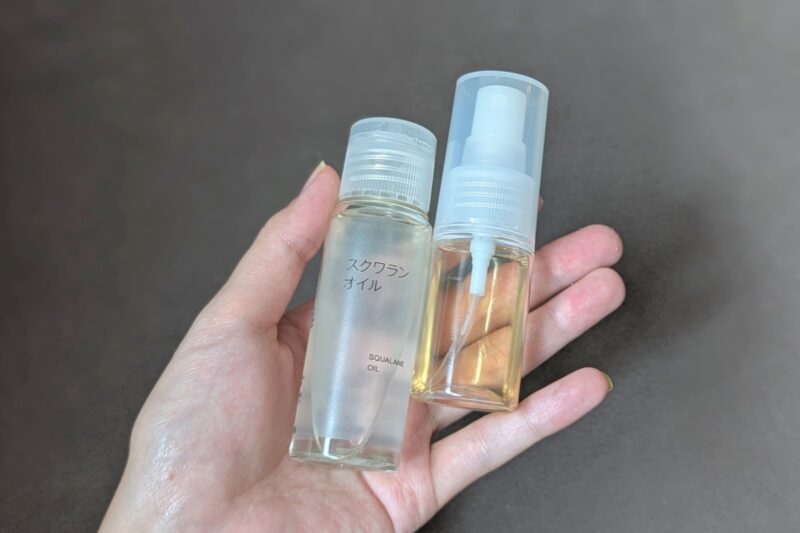 instagramでフォローしているハンドモデルの方が、無印のスプレーボトルに入れた化粧水&ミニサイズのオイルで日中の手の保湿をしていると投稿してらして、真似してみることに。
