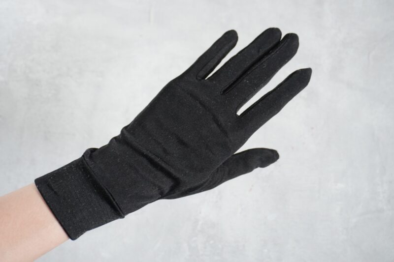 一方のシルク100%手袋は、薄手でピタッとした密着感が特徴。手の動きの邪魔になりません。シルクのツヤ感のおかげで家の外で使ってもあまり違和感がなく、これはこれで使いやすい。