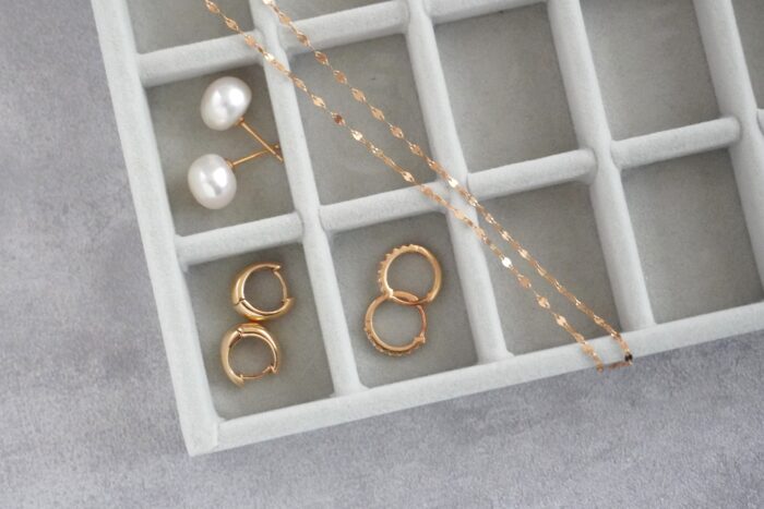 左からプチプラの直径2cmほどのフープ、カルティエのトリニティピアス、4回くらいリピしているK18のミニフープ、ツツミのダイヤフープピアスです。
